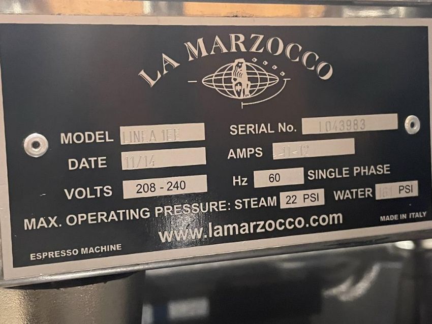 La Marzocco LINEA 1 Group EE (Semi-Automatic) Espresso Machine with Centrifugal Pump; YOM: 11/14; 208-240V 60Hz. S/n# L043983. HIT# 2319498. Loc: 6th Flr Counter. Asset Located In 1355 Market St., San Francisco, CA 94103.