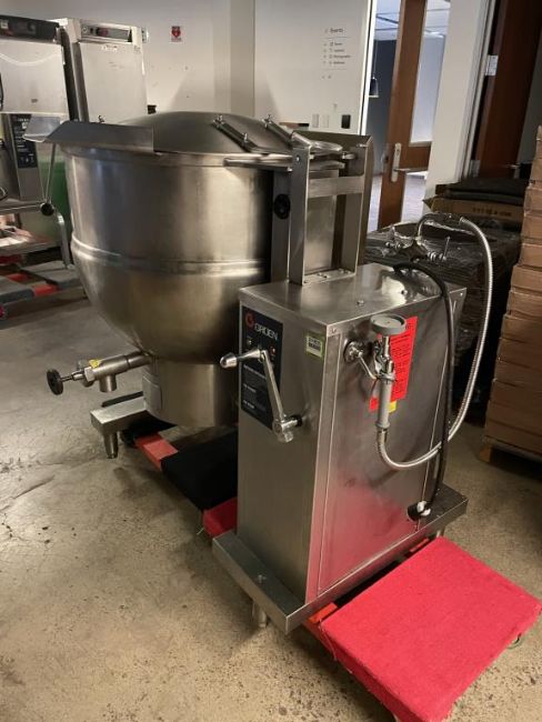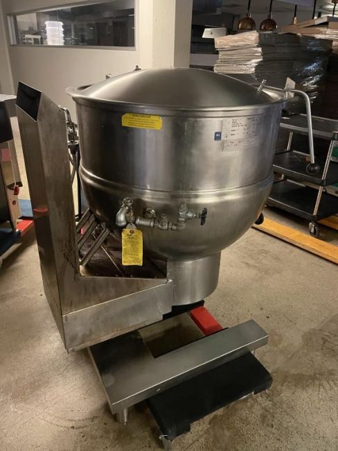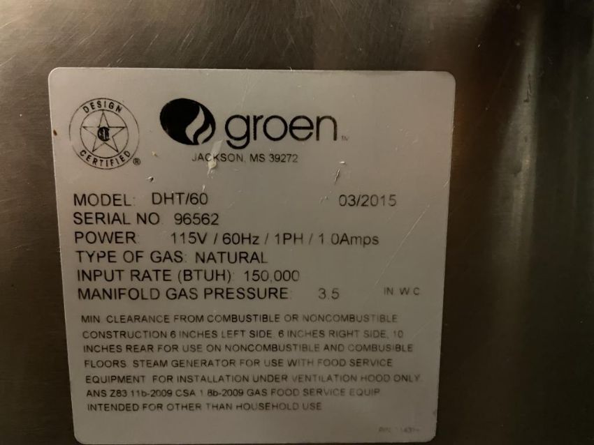 Groen DH-60C 60 Gallon Steam Jacketed Tilting Kettle, Natural Gas, YOM: 2015, 115V, 60Hz, 1PH. S/n# 96562. Overall Dims = 48"W x 51"H x 37"D. HIT# 2319535. Loc: 6th Flr. Asset Located In 1355 Market St., San Francisco, CA 94103.