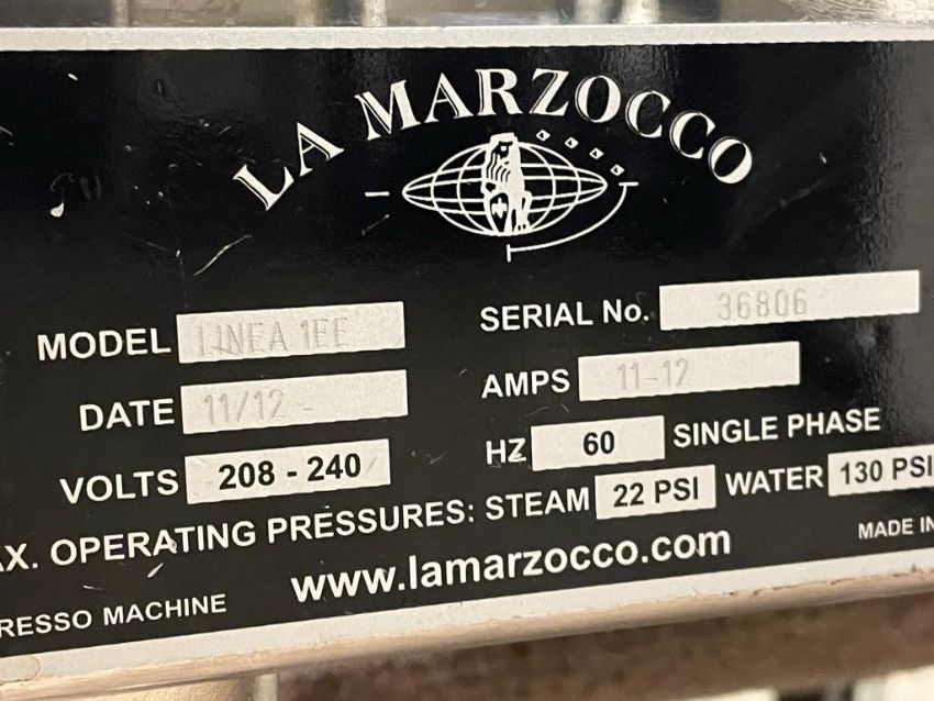 La Marzocco LINEA 1 Group EE (Semi-Automatic) Espresso Machine with Centrifugal Pump; YOM: 11/12; 208-240V 60Hz. S/n# 36806. HIT# 2365807. Loc: 6th Flr. Asset Located In 1355 Market St. San Francisco, CA 94103.