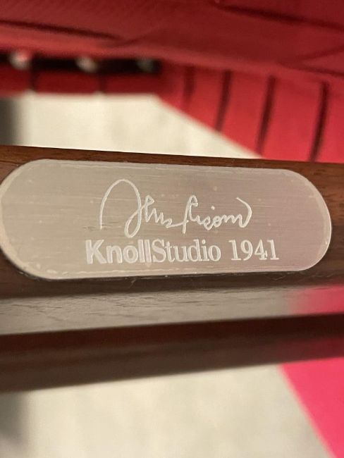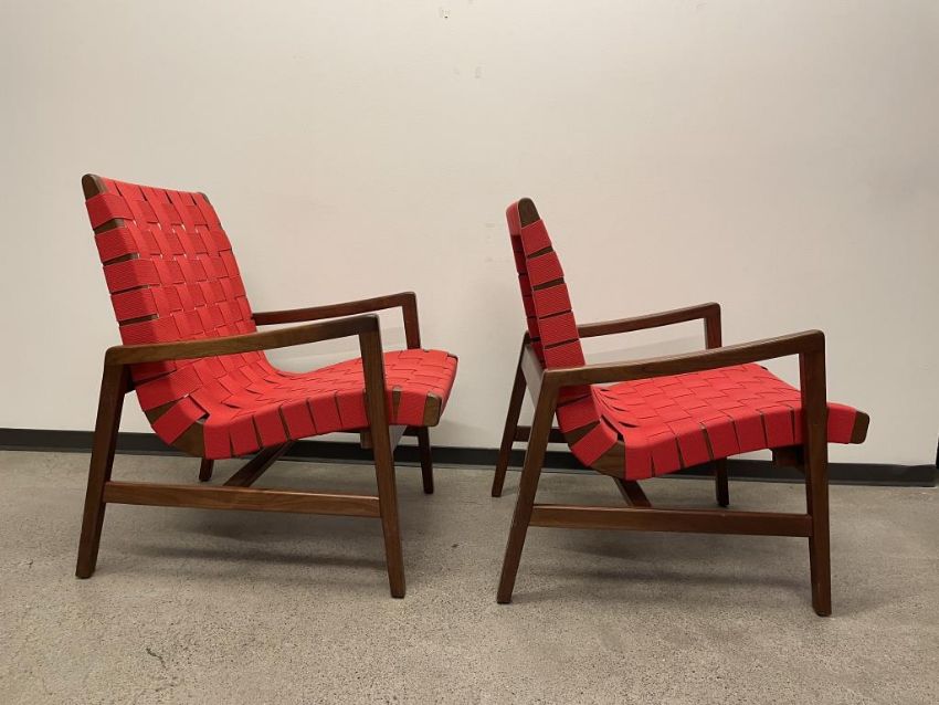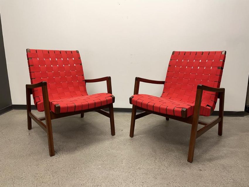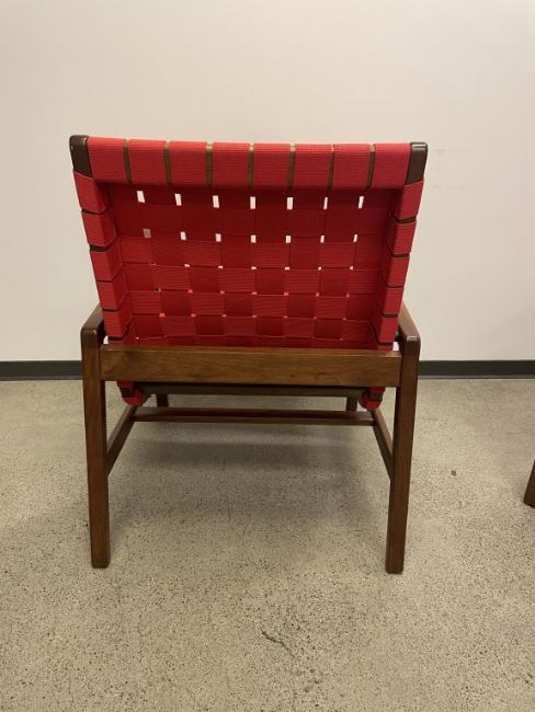 (2) Knoll Studio Risom Lounge Chair, Walnut, Red Cotton Webbing, with Arms, Designed by Jen Risom. Overall Dims = 23.75"W x 27.72"D x 30.25"H. HIT# 2319739. Loc: 6th Flr Office. Asset Located In 1355 Market St., San Francisco, CA 94103.