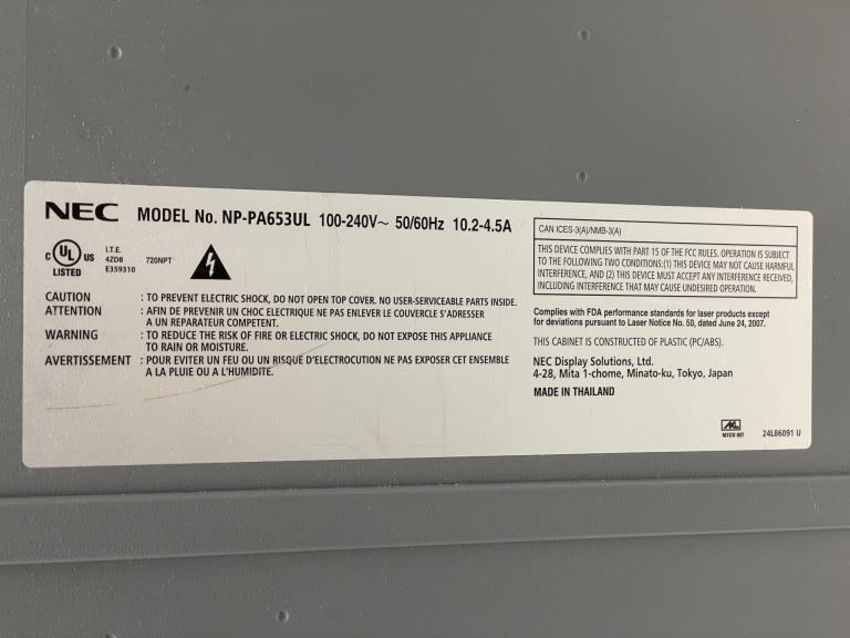 NEC NP-PA653UL 6500-Lumen WUXGA LCD Professional Installation Laser Projector, 100-240V 10.2-4.5A, NP41ZL Zoom Lens, YOM: 11/2018, White *No Remote*. S/n# 8Y00372RW. HIT# 2319578. Loc: 6th Flr Office 6326. Asset Located In 1355 Market St., San Francisco, CA 94103.