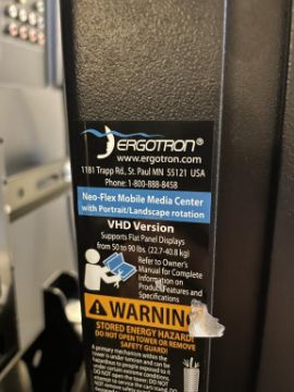 Lot Includes Sharp AQUOS 60" LC-60LE831U LED-LCD TV with Ergotron Neo-Flex VHD Mobile Media Center with Portrait/Landscape Rotation. HIT# 2319662. Loc: 6th Flr Office. Asset Located In 1355 Market St., San Francisco, CA 94103.