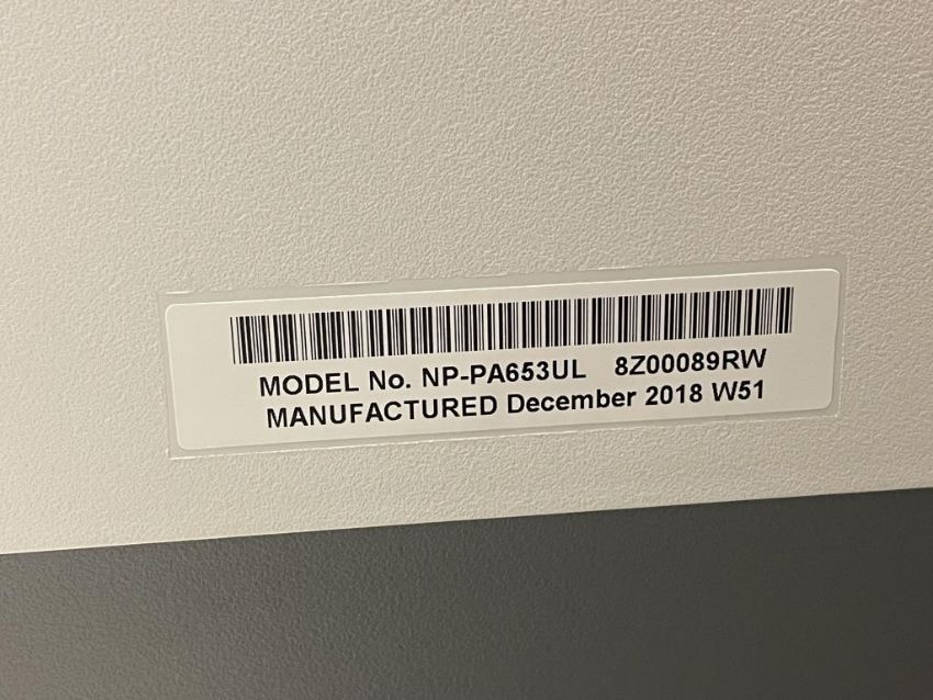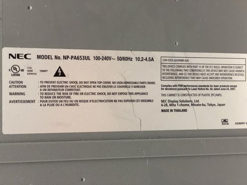 NEC NP-PA653UL 6500-Lumen WUXGA LCD Professional Installation Laser Projector, 100-240V 10.2-4.5A, NP41ZL Zoom Lens, YOM: 12/2018, White *No Remote*. S/n# 8Z00089RW. HIT# 2319575. Loc: 6th Flr Office 6326. Asset Located In 1355 Market St., San Francisco, CA 94103.