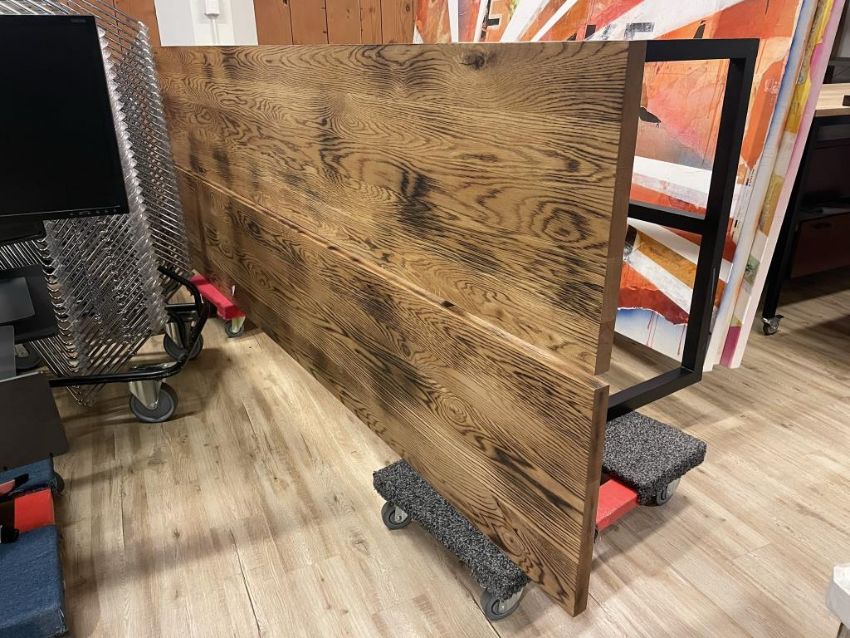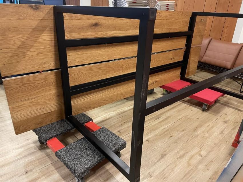 OHIO Design High top Table, Solid Wood Top, Hand Welded Steel Frame. Dims = 120"L x 42"D x 42.25"H. HIT# 2319783. Loc: 6th Flr Office. Asset Located In 1355 Market St. San Francisco, CA 94103.