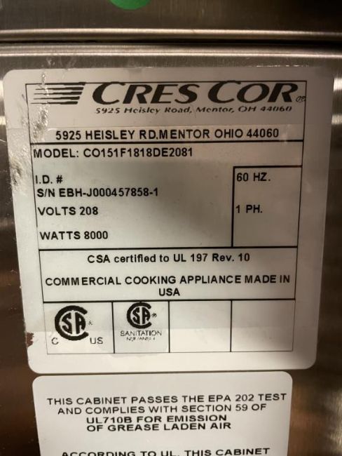 Cres Cor CO-151-F-1818DE Full-Size Mobile Cook and Hold Oven, 208v/1ph, On Wheels. S/n# EBH-J000457858-1. Overall Dims = 24.5"W x 73"H x 32"D. HIT# 2319532. Loc: 6th Flr. Asset Located In 1355 Market St., San Francisco, CA 94103.
