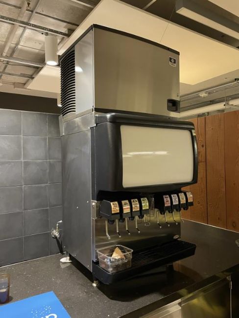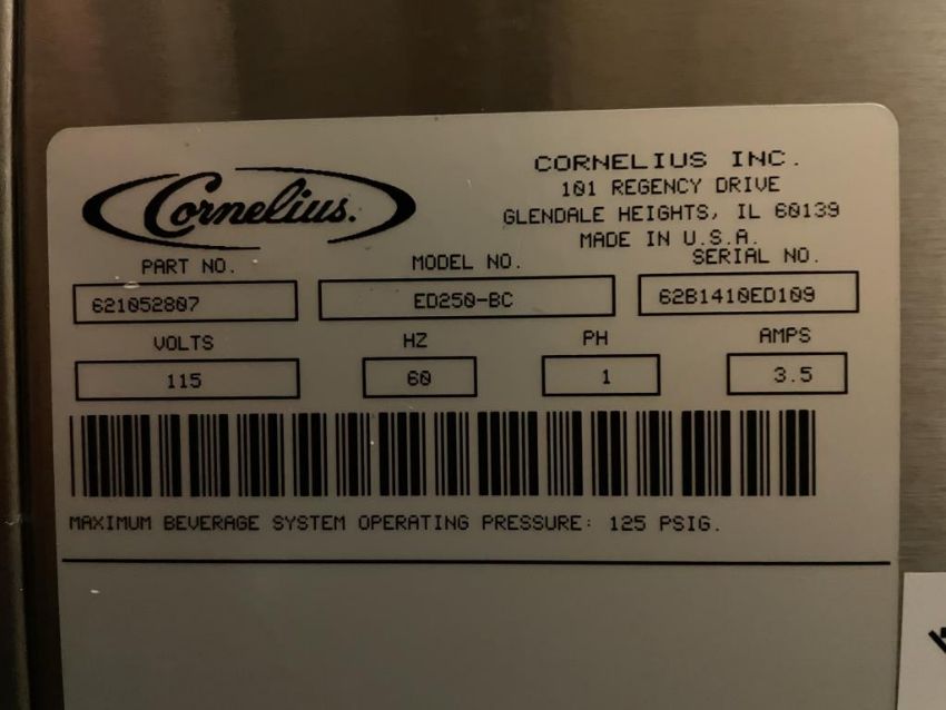 Cornelius ED-250-BC Ice Drink Dispenser with Manitowoc Ice Machine and Compressor. S/n# S62B1410ED109. Overall Dims = 30"W x 65.5"H x 31.5"D. HIT# 2319679. Loc: 6th Flr. Asset Located In 1355 Market St., San Francisco, CA 94103.