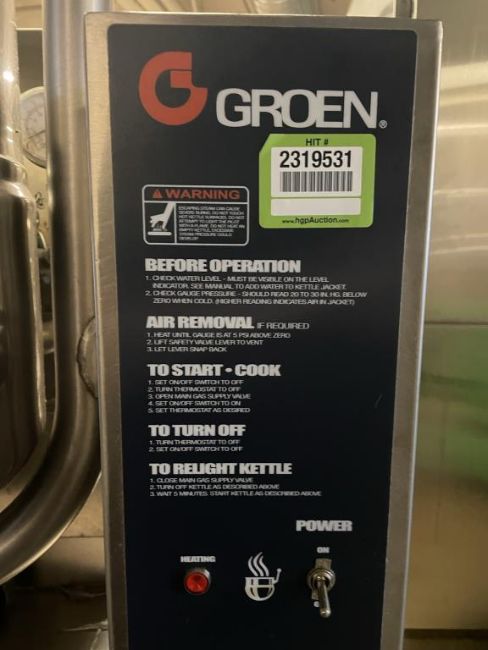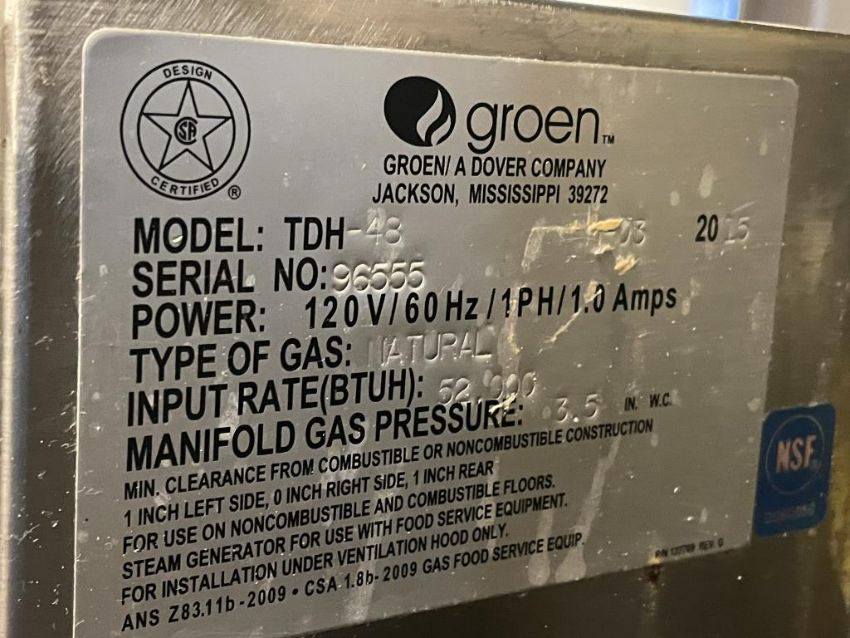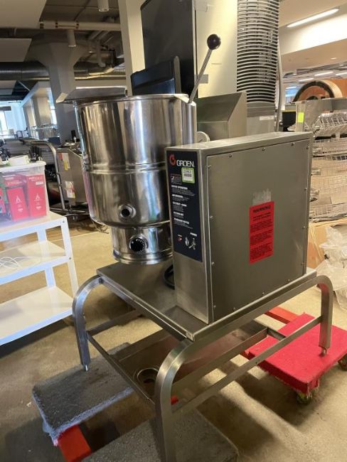 Groen TDC-48 Steam Jacketed Tilting Kettle, Natural Gas on Stand, YOM: 2015, 120V/60Hz. S/n# 96555. Overall Dims = 28"W x 47.5"H x 38"D. HIT# 2319531. Loc: 6th Flr. Asset Located In 1355 Market St., San Francisco, CA 94103.