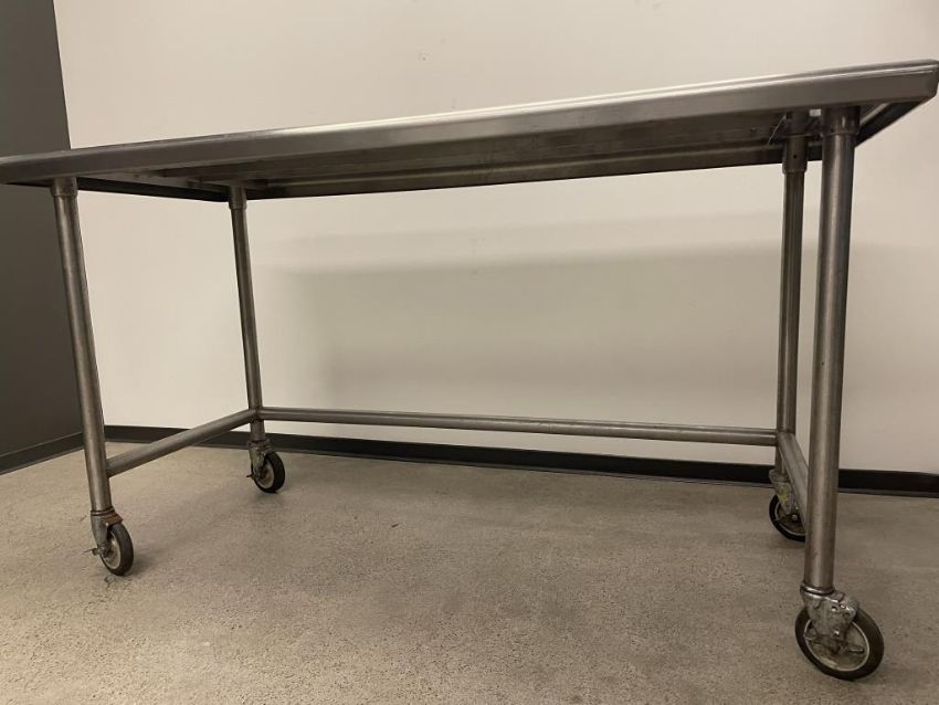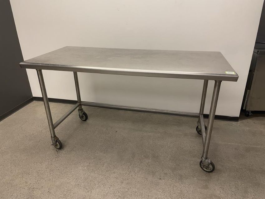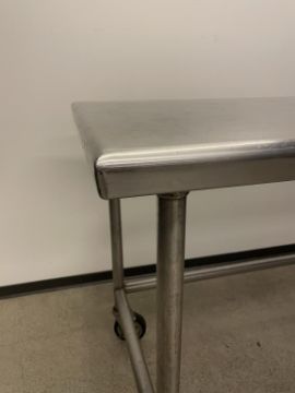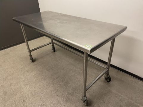 Stainless Steel Table, Rounded Edges, On Wheels. Dims = 66"L x 30"D x 35.75"H. HIT# 2319764. Loc: 6th Flr. Asset Located In 1355 Market St. San Francisco, CA 94103.