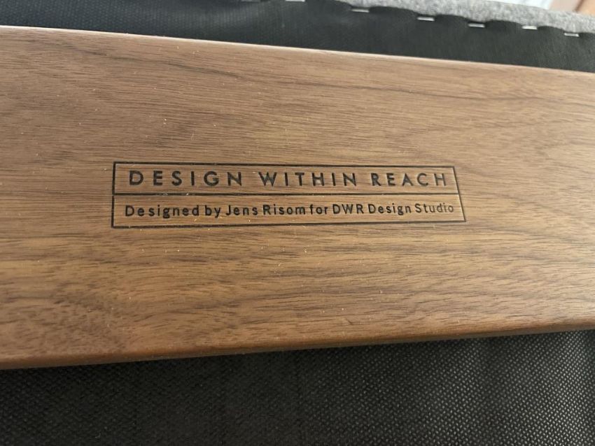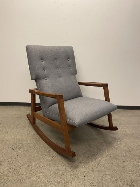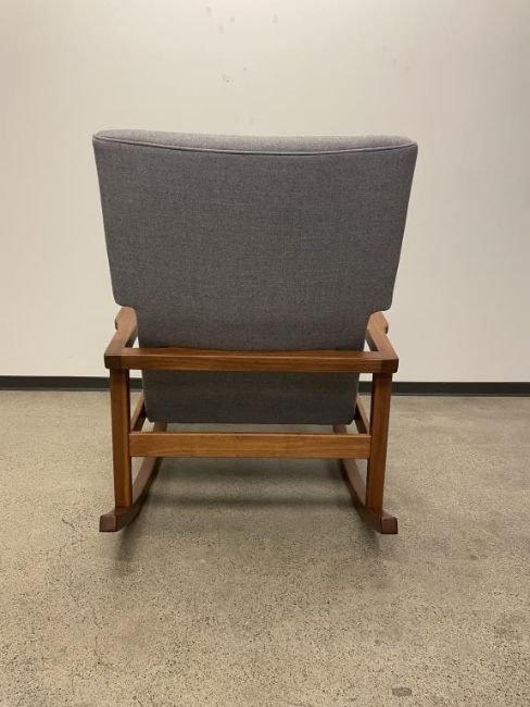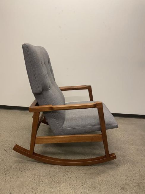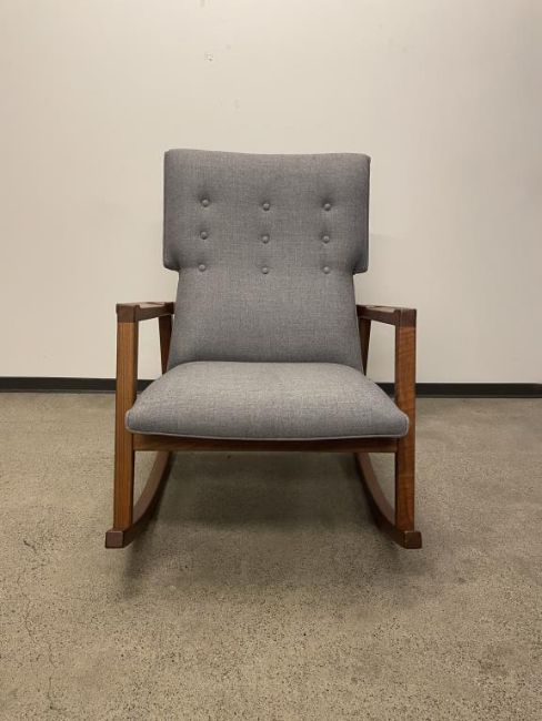 DWR Risom Rocker Chair, Walnut Frame, Heather Lama Tweed Fabric. Overall Dims = 39" H 29" W 36" D. HIT# 2319738. Loc: 6th Flr Office. Asset Located In 1355 Market St., San Francisco, CA 94103.