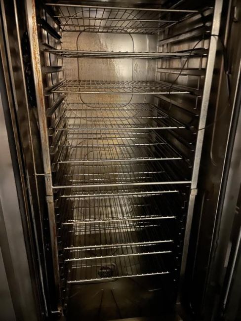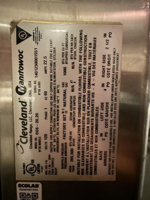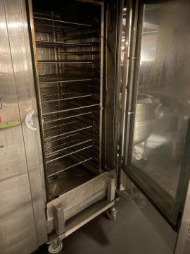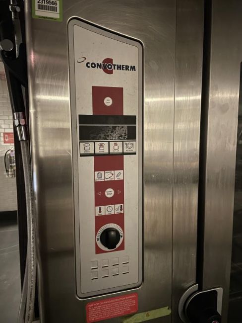 Cleveland OGS-20.20 Convotherm Natural Gas, Oven/Steamer with Trolly. S/n# 1401230001551. Overall Dims = 48.5"W x 77.25"H x 42"D. HIT# 2319566. Loc: 6th Flr Kitchen. Asset Located In 1355 Market St., San Francisco, CA 94103.