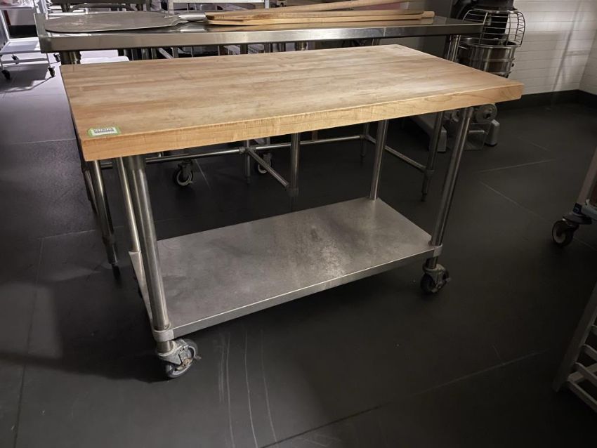 1.75" thick hard maple work top Table with Stainless Steel Base & Bracing, On Wheels. Dims = 48"L x 24"D x 33.5"H. HIT# 2319778. Loc: 6th Flr Kitchen. Asset Located In 1355 Market St. San Francisco, CA 94103.