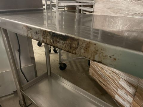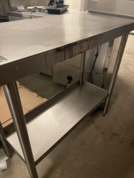 Stainless Steel Table with 6"H Back Splash. Dims = 18"W x 42"D x 37"H. HIT# 2319770. Loc: 6th Flr. Asset Located In 1355 Market St. San Francisco, CA 94103.