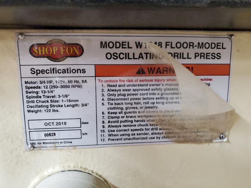 Shop Fox W1848 Floor Model 13-1/4" Oscillating Drill Press, 3/4 HP. HIT# 2300854. Wood Shop. Asset Located at 6607 Mountain View Rd., Ooltewah, TN 37363.
