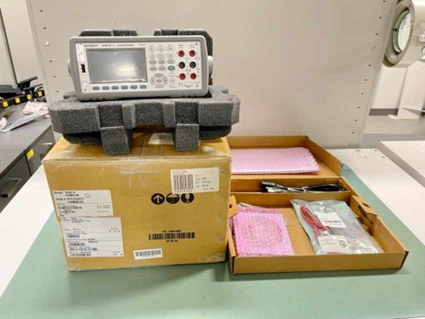 Keysight 34461A True Volt Digital 6.5 Digit Multimeter. Basic DCV Accuracy 35 ppm, Max Reading Rate 1,000 rdgs/s, Memory 10,000 rdg. Measurements: DCV: 100 mV to 1,000 V, ACV (RMS) 100 mV to 750 V, DCI 100 ?A to 10A, ACI 100 ?A to 10A, 2- and 4-Wire Resistance 100 ? to 100 M?, Continuity, Diode Y, 5 V, Frequency, Period 3 Hz to 300 kHz, Temperature RTD/PT100, Thermistor, Capacitance 1.0 nF to 100.0 ?F. Unused In Manufacturer's Box. SN# MY57215983. HIT# 2337966. Go-1 Tag-Lab. Asset(s) Located at 3545 SW 47th Ave., Gainesville, FL 32608. ***ALL ASSETS MUST BE REMOVED PRIOR TO APRIL 22, 2022. PLEASE KEEP THIS IN MIND WHEN BIDDING***
