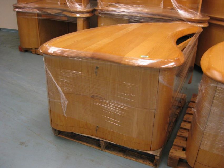 (Qty 1) Desk on pallet. Desk is made of a solid maple top and plywood base and drawers. Desk is oblong in shape and measures: 68"x48"x29"tall with 2 side drawers. Solid desktop is 1 1/2" thick. HIT# 2291069. Room 162. Asset Located at 1 Corporate Woods Dr., Bridgeton, MO 63044.