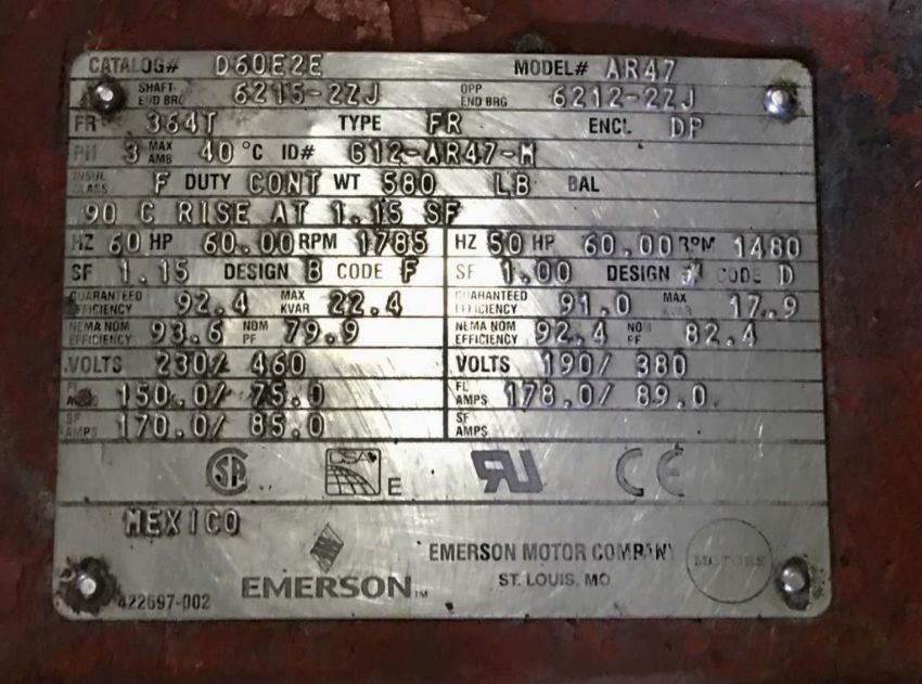 Emerson AR47 Motor is 230/460 volt, 3 PH, 60 HP, 1785 RPM. HIT# 2291032. Warehouse Mechanical Room. Asset Located at 1 Corporate Woods Dr., Bridgeton, MO 63044.