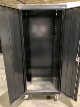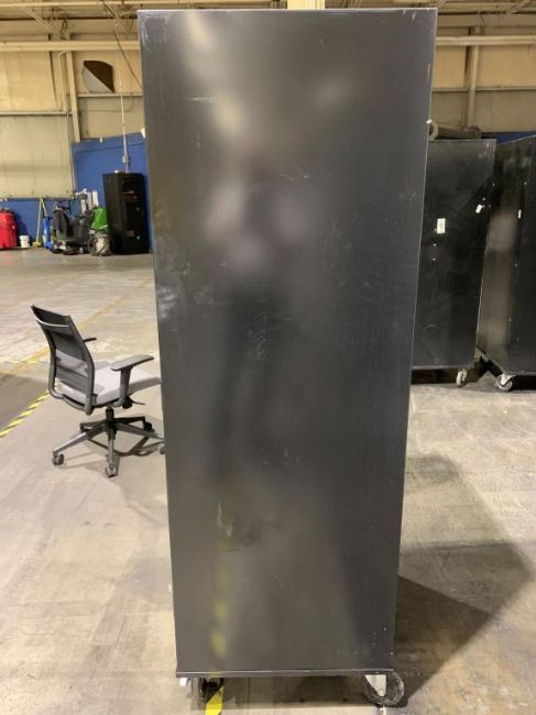 Sandusky Black Storage Cabinet, 30"Wx24"Dx66"H Cabinet on wheels, 2 doors, no shelving. HIT# 2335990. Asset Located at 100 Central Avenue West, Brockville, ON K6V 4N8 Canada.