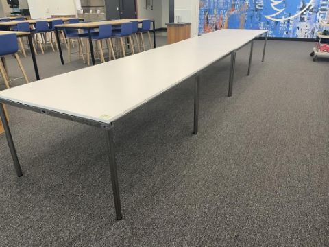 (4) Howe Simpla Rectangle Folding Table, Chrome Frame, White Top (Danish Design). Dims = 55"L x 42"D x 28.5"H. HIT# 2366012. Loc: Bldg2-9 / Café. Asset Located In 1355 Market St. San Francisco, CA 94103.