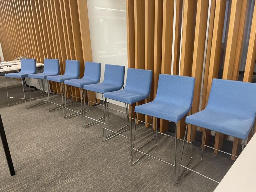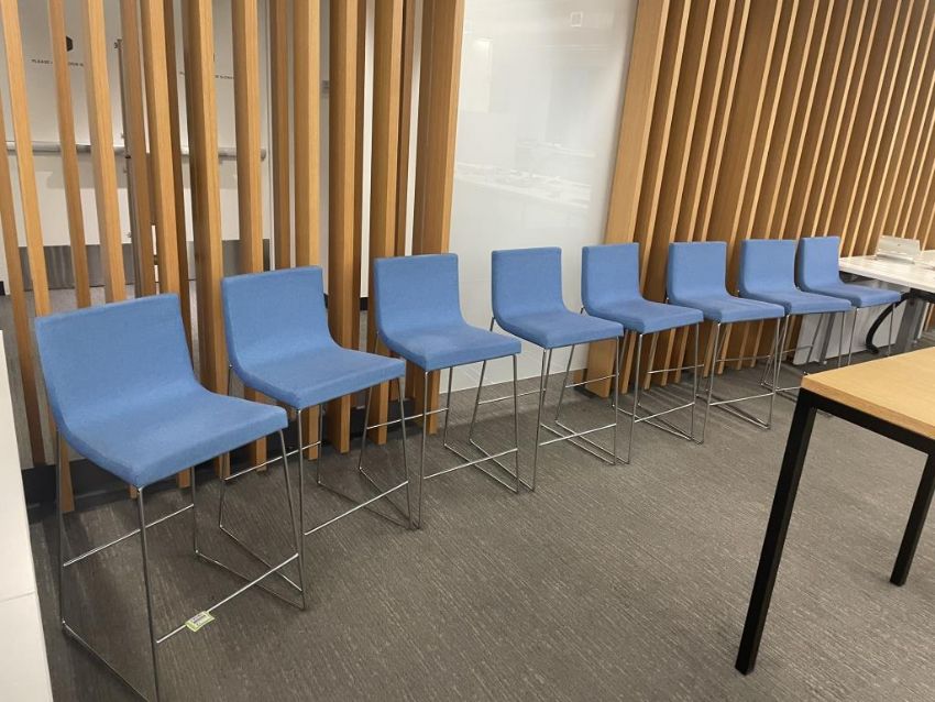 (8) Andreu World Lineal Comfort Counter Stools, Blue Fabric. Dims = 19.5"W x 20.25"D x 36"H / 25.5" Seat H. HIT# 2365991. Loc: Bldg2-8 / B8-876. Asset Located In 1355 Market St. San Francisco, CA 94103.