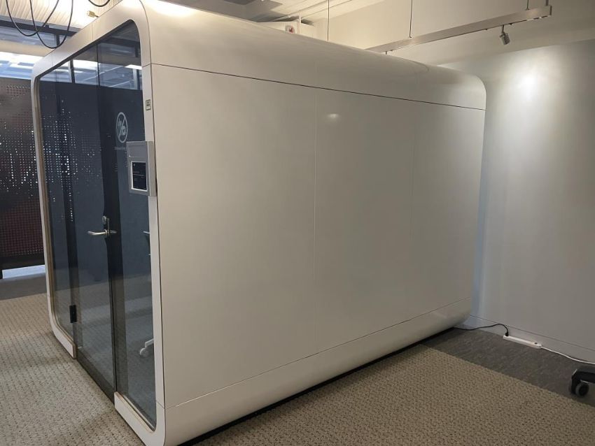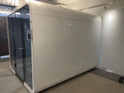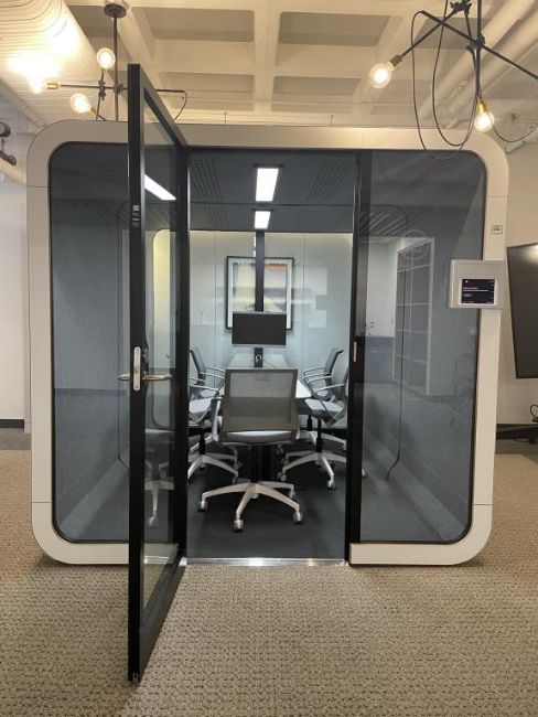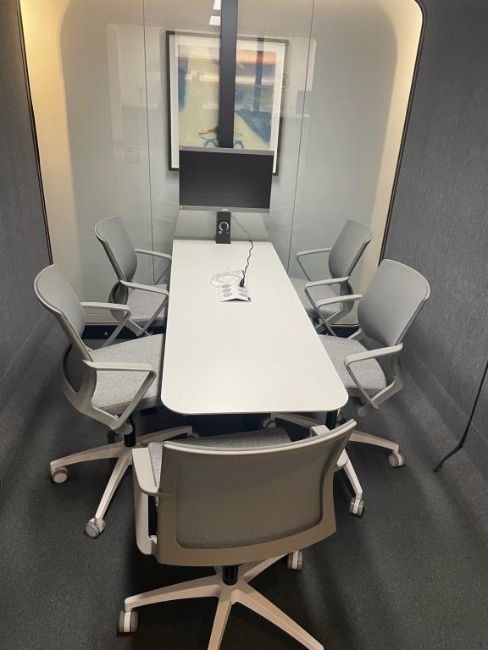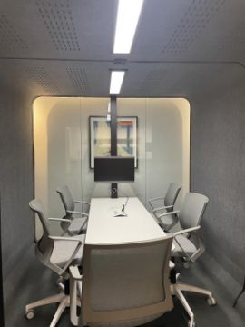 Framery Acoustics Soundproof Conference Room Booth with Chrome Acer Video Monitor and Dimmable Sensor Lights and Cooling Fan; Includes (5) Movi Chairs. **System must be disassembled before moving**See Photos for More Details**. Overall Dims = 110.5"L x 92.5"W x 87.25"H. HIT# 2366021. Loc: Bldg2-9 / B9-948. Asset Located In 1355 Market St. San Francisco, CA 94103.