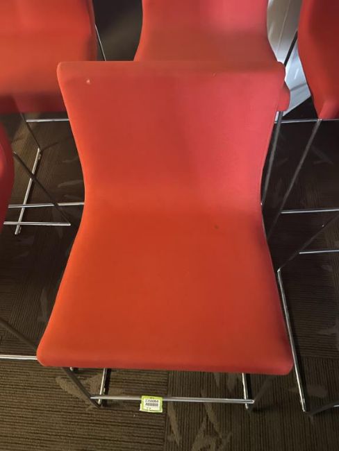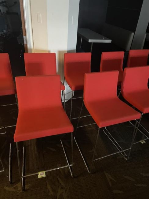 (5) Andreu World Lineal Comfort Counter Stools, Red Fabric. Dims = 19.5"W x 20.25"D x 36"H / 25.5" Seat H. HIT# 2366064. Loc: 6th Flr. Asset Located In 1355 Market St. San Francisco, CA 94103.