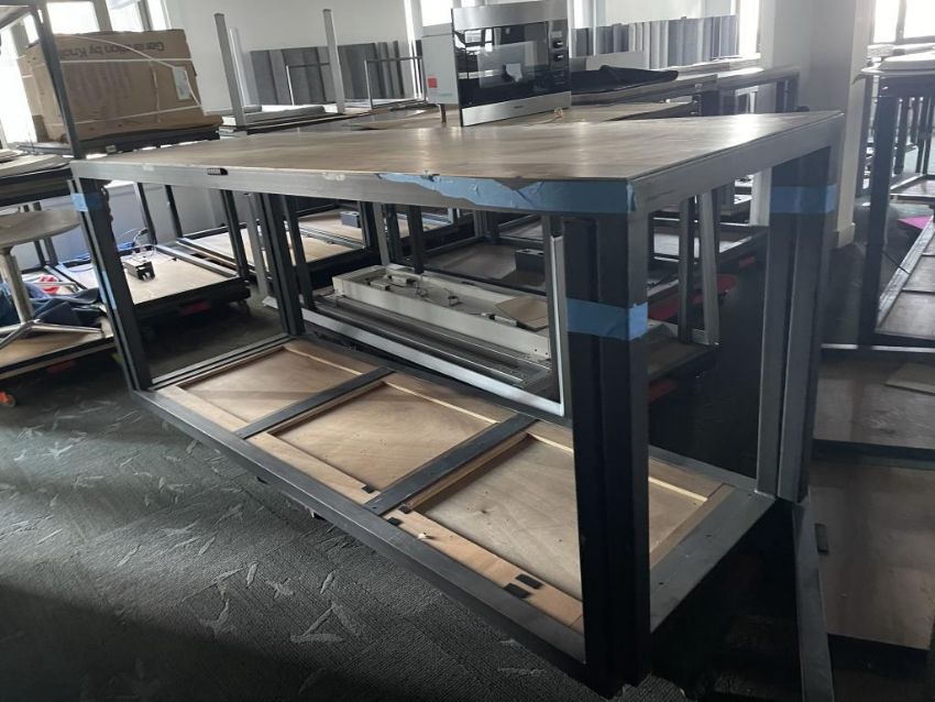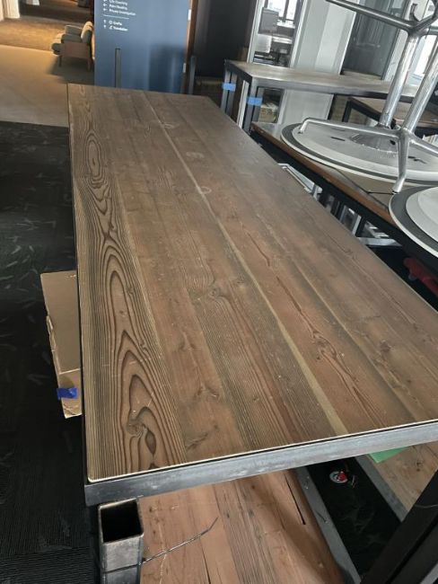 (4) Custom High Top Wood Tables, Hand Welded Steel Frame. Dims = 108"L x 36"D x 42"H. HIT# 2365845. Loc: 6th flr Office. Asset Located In 1355 Market St. San Francisco, CA 94103.