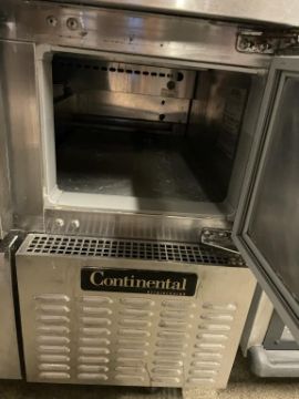 Continental Refrigerator CPA43 Refrigerated Counter, Pizza Prep Table, On Wheels. S/n# 15230611. Overall Dims = 43"W x 39.5"H x 34.5"D. HIT# 2319521. Loc: 6th Flr. Asset Located In 1355 Market St., San Francisco, CA 94103.
