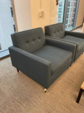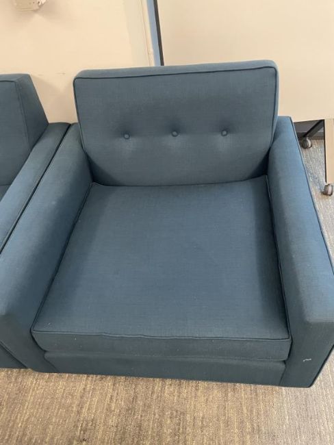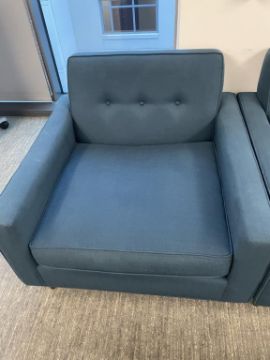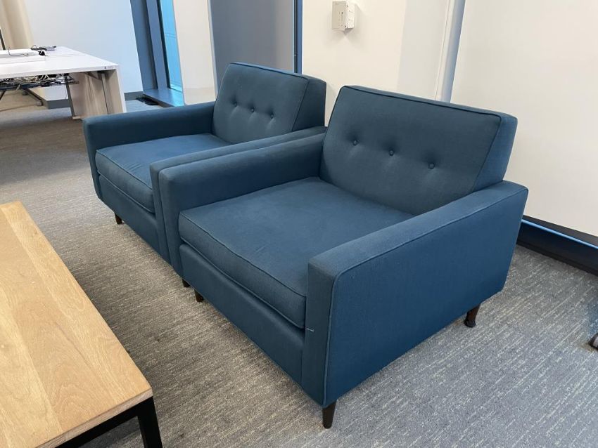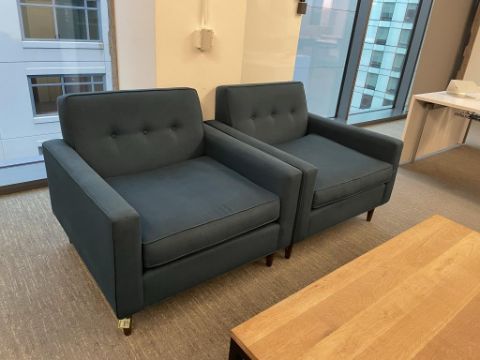 (2) Thrive "Fred Chair" Lounge Chairs, Dark Blue with (1) OHIO Coffee Table 60"x30". Overall Dims = 39"W x 39"D x 35"H / 29" Seat D. HIT# 2365978. Loc: Bldg2-8 / B8-856. Asset Located In 1355 Market St. San Francisco, CA 94103.