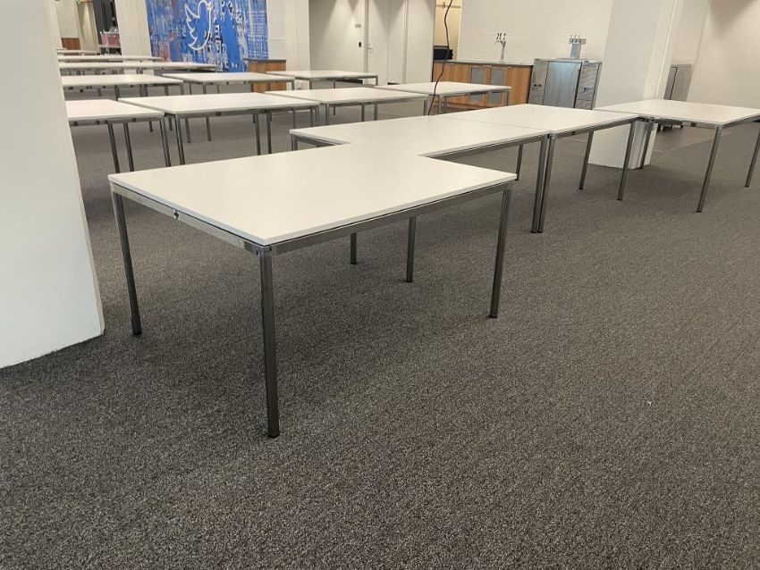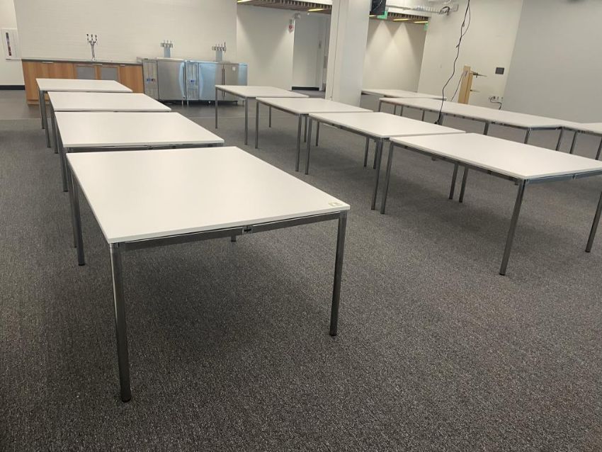 (12) Howe Simpla Rectangle Folding Table, Chrome Frame, White Top (Danish Design). Dims = 55"L x 42"D x 28.5"H. HIT# 2366015. Loc: Bldg2-9 / Café. Asset Located In 1355 Market St. San Francisco, CA 94103.