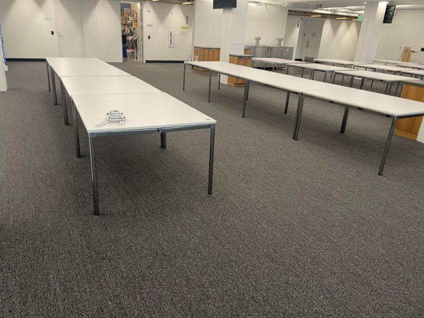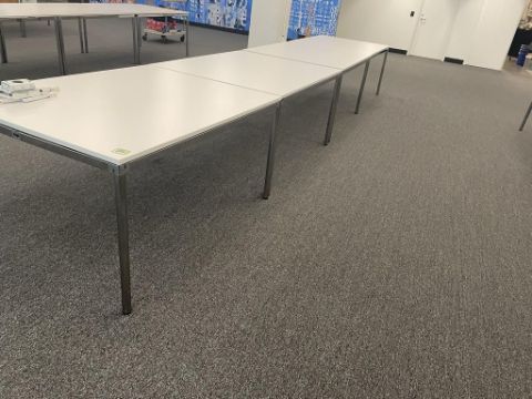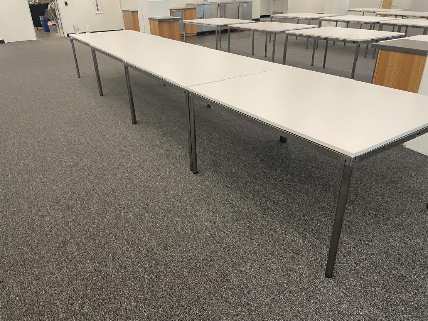 (8) Howe Simpla Rectangle Folding Table, Chrome Frame, White Top (Danish Design). Dims = 55"L x 42"D x 28.5"H. HIT# 2366014. Loc: Bldg2-9 / Café. Asset Located In 1355 Market St. San Francisco, CA 94103.