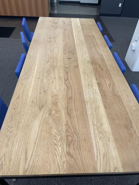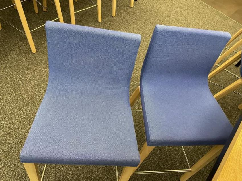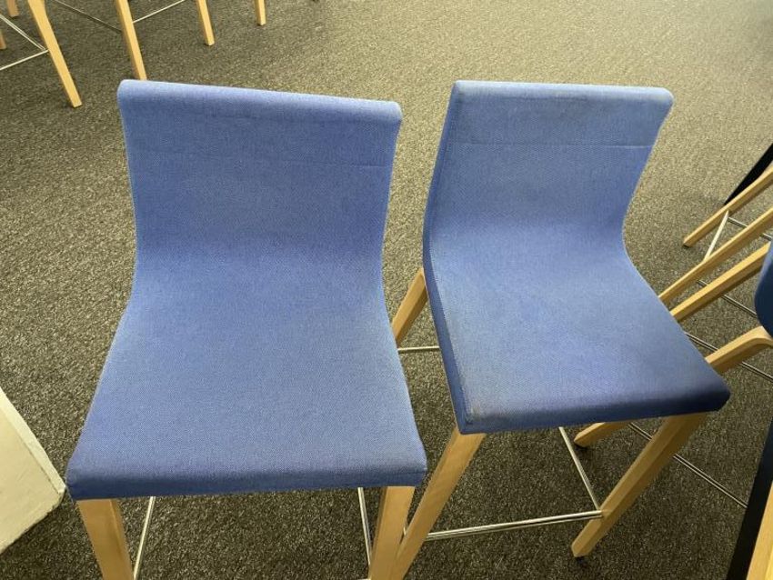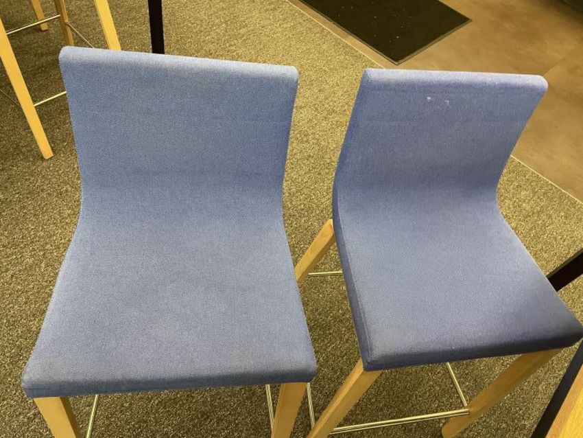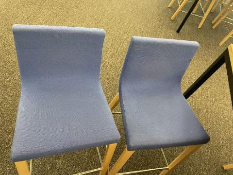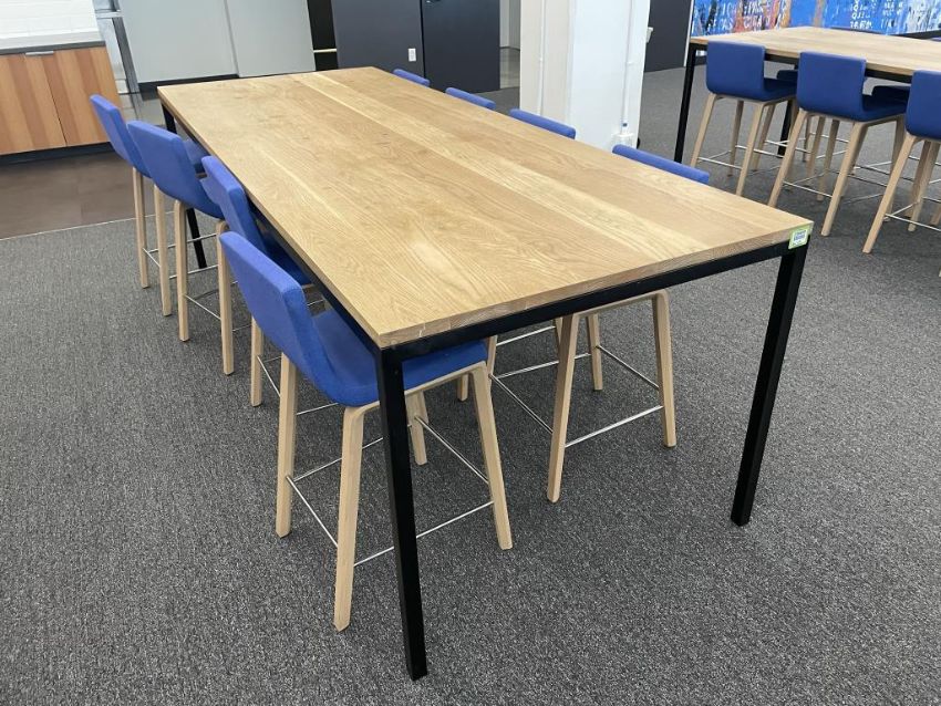 Lot Includes: (8) Andreu World Lineal Comfort Counter Stools, Solid Beech Wood Base, Blue Fabric Chair Dims = 19.25"W x 20.25"D x 36.5"H. And (1) OHIO Design Table Dims 110"L x 42"D x 36"H. HIT# 2366009. Loc: Bldg2-9 / Café. Asset Located In 1355 Market St. San Francisco, CA 94103.
