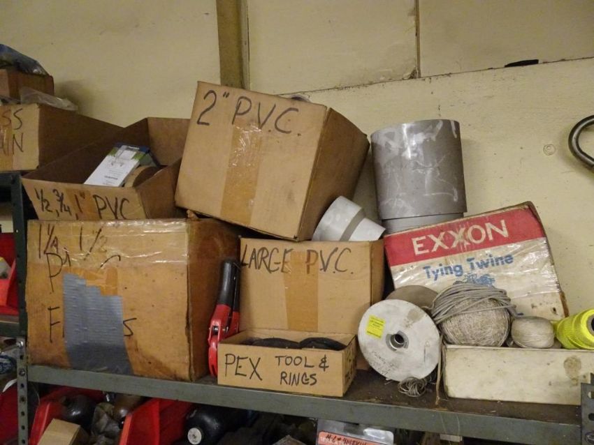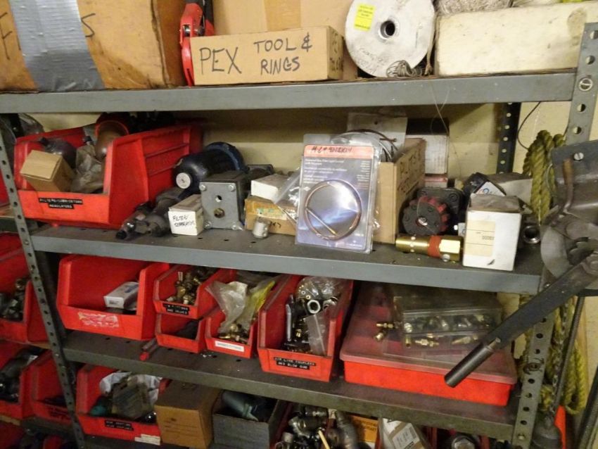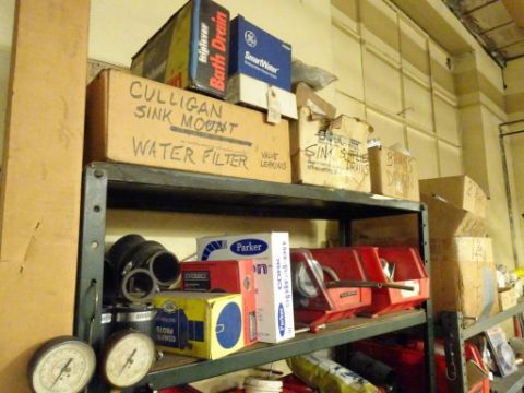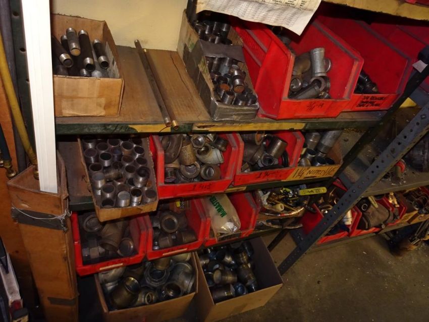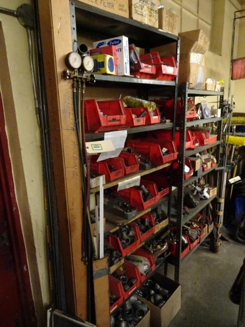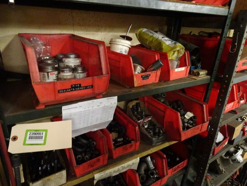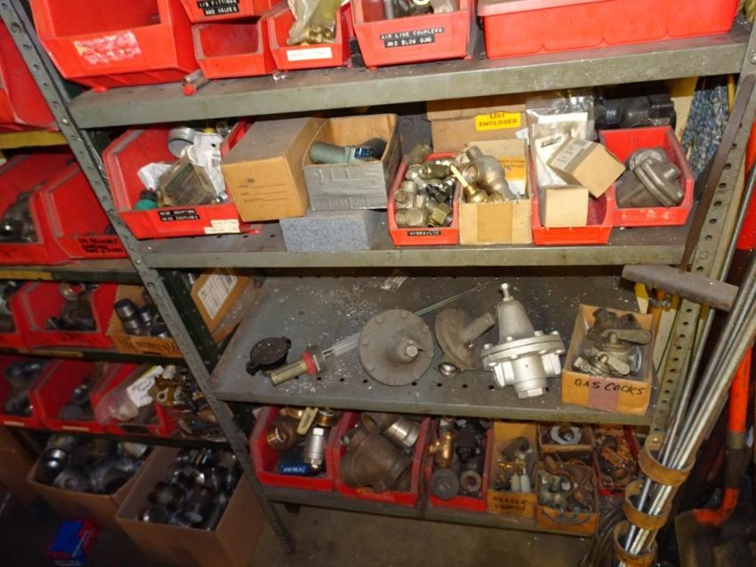 Lot: (2) Shelving Units of assorted MRO. Including But Not Limited To: Refrigerant Recovery System, Misc. Water Filters, Sweating Tools, Various Black pipe, Couplings, Unions, Elbows, T's, Various Valves, Turk Valves, Hose Adaptors, Fittings, Lubricators, Lubricants, Hex Tool Rings, Gas Cocks, Needle Valves, and Assorted Other Items. HIT# 2390951. Maintenance. Asset Located at 1112 Walnut Street, Roselle, NJ 07203.
