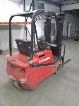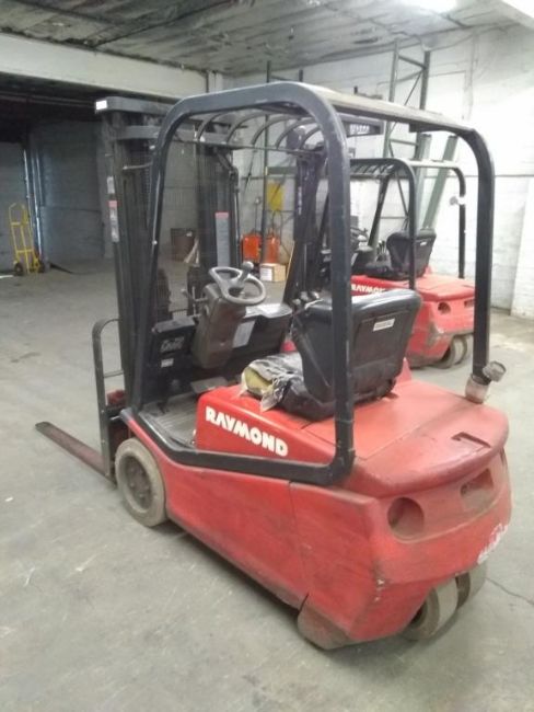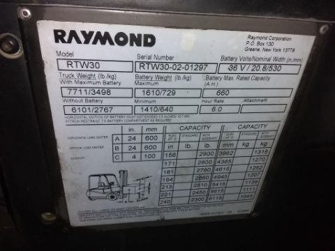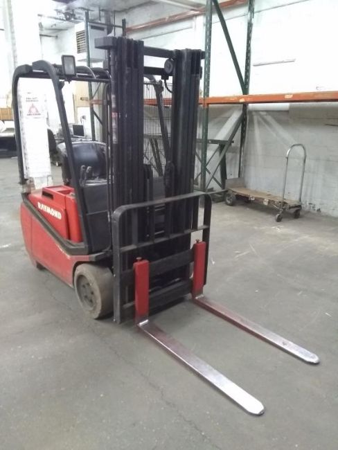 Raymond RTW30 36V, 3,000 lb. Capacity Electric 3-Wheel Forklift With 3-Stage Mast, 42" Forks, 660AH @ 6 Hour, Hours Unknown. SN# RTW30-02-01297. HIT# 2390964. Packaging. Asset Located at 1112 Walnut Street, Roselle, NJ 07203.