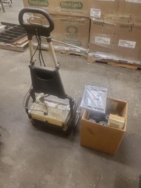 Tacony / Power-Flite PFMW14 Multiwash 14" Single Pass Floor Scrubber With Spare Brushes. HIT# 2390969. Asset Located at 1112 Walnut Street, Roselle, NJ 07203.