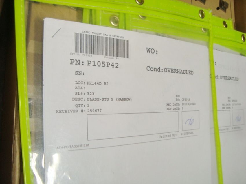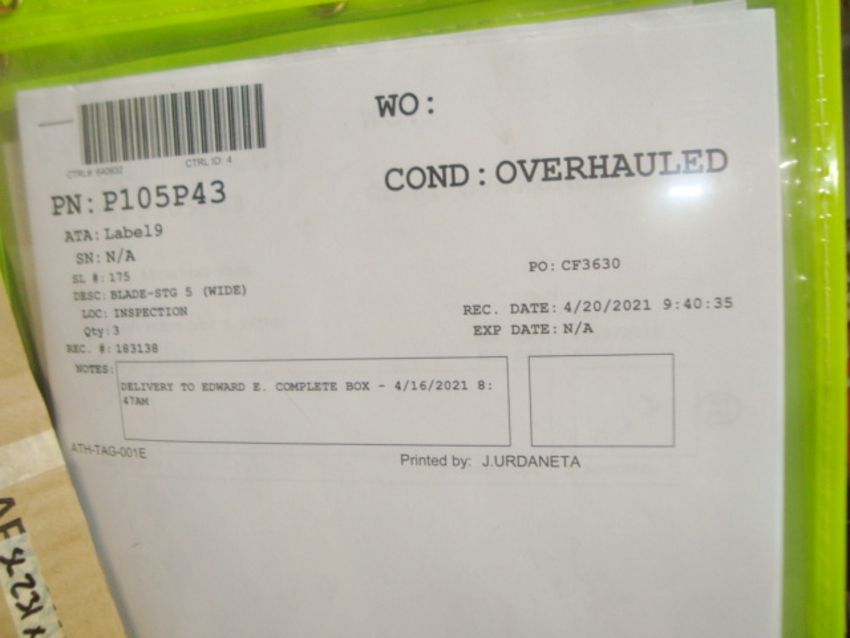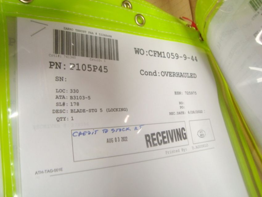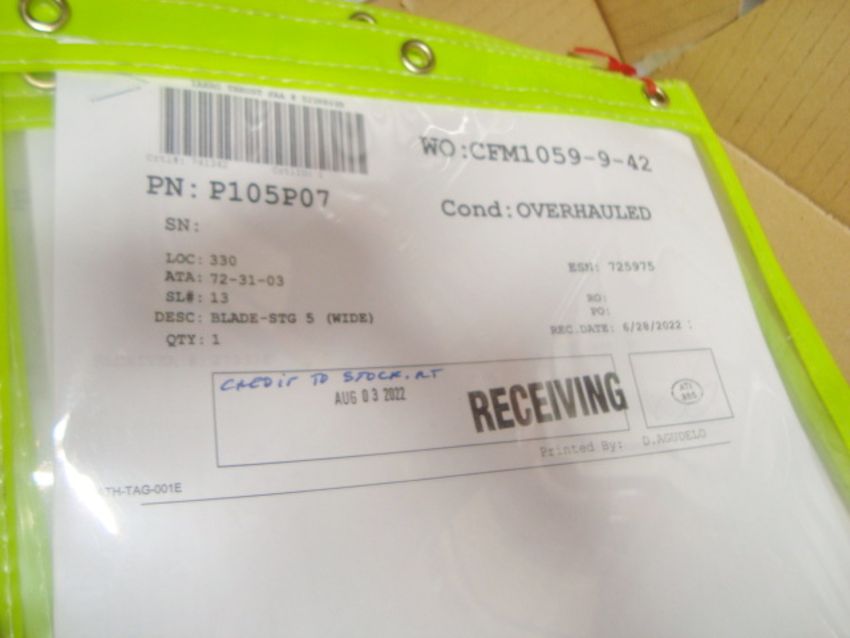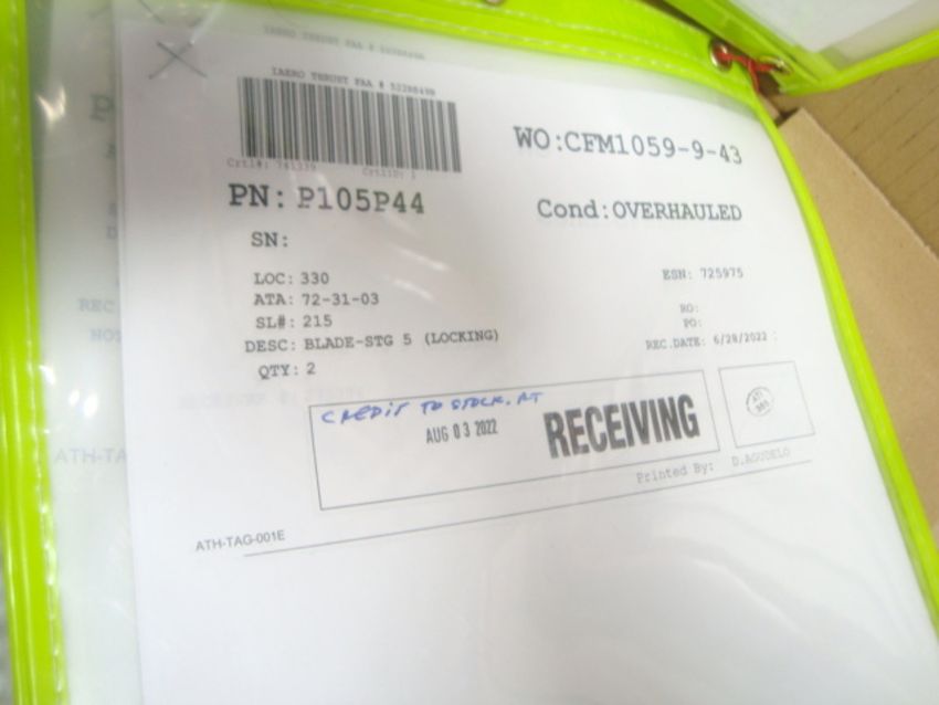 CFM56-3 Jet Engine Parts Inventory To Include: BLADES-STG 4, 5 & 8 (LOCKING), WIDE & (NARROW), BLADES-STG 4 (WIDE). Condition: New & Overhauled. See Inventory Link For More Complete Inventory Listing & Qty Details. HIT# 2373506. Asset Located at 5300 NW 36th St., Miami , FL 33122. Main Bldg. 2nd Fl Parts, Racks:2PSERV9C. *Sale is Subject to Seller Confirmation with Bulk Sale Lot 1229.*