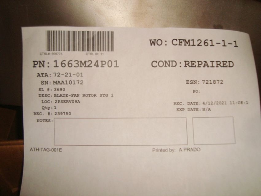 CFM56-3 Fan Rotor Blades Stage 1. Condition: Repaired. See Inventory Link For More Complete Inventory Listing & Qty Details. HIT# 2373502. Asset Located at 5300 NW 36th St., Miami , FL 33122. Main Bldg. 2nd Fl Parts, Racks:2PSERV9A. *Sale is Subject to Seller Confirmation with Bulk Sale Lot 1229.*