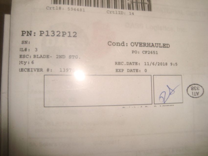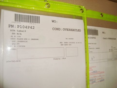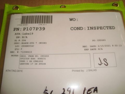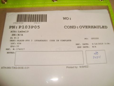 CFM56-3 Jet Engine Parts Inventory To Include: BLADE-STG 3 (STANDARD), BLADE-STG 4 (WIDE), BLADE-STG 4, 5, 6 & 7 (NARROW), BLADE-STG 7 (WIDE), Condition: Overhauled & Repaired. See Inventory Link For More Complete Inventory Listing & Qty Details. HIT# 2373489. Asset Located at 5300 NW 36th St., Miami , FL 33122. Main Bldg. 2nd Fl Parts, Racks:2PSERV14C. *Sale is Subject to Seller Confirmation with Bulk Sale Lot 1229.*