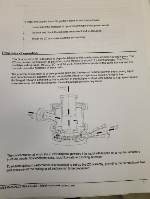 Quadro Ytron ZC High Speed Inline Disperser, used for both inline single-pass and recirculating powder dispersion applications. Equipped with a 3HP/3490RPM/208-230V 3phase Leeson Washguard electric motor. HIT# 2337575. Loc: 1116. Asset Located at 400 Iroquois Shore Road, Oakville, ON L6H 1M5, Canada.