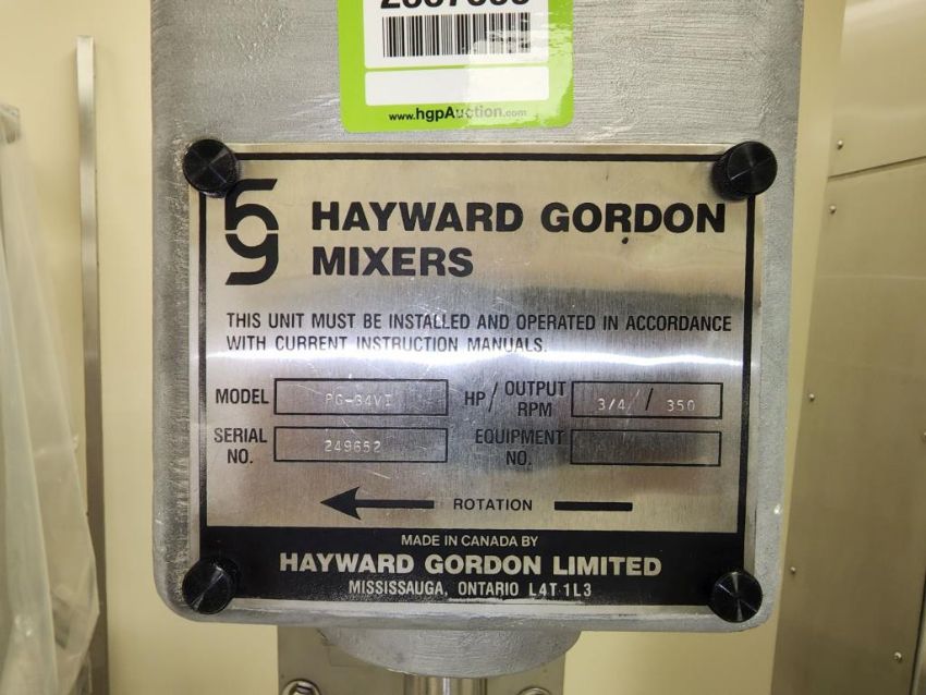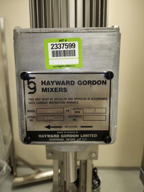 Hayward-Gordon PG-VI Mixer on mobile stand with winch to raise and lower mixer. 180V, DC/ 3HP, 1750 RPM w/ Speed Control. 249652 HIT# 2337599. Loc: 1117. Asset Located at 400 Iroquois Shore Road, Oakville, ON L6H 1M5, Canada.