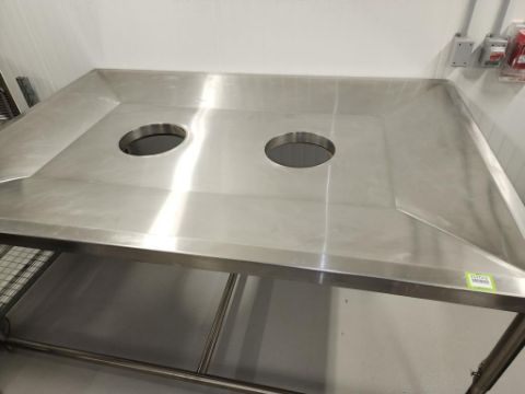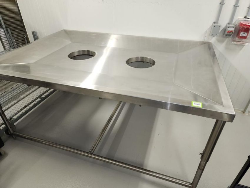 Stainless Steel Trim Table, 80:x54", 2 holes. HIT# 2337312. Y2. Asset Located at 16 Upton Road, Scarborough, ON, M1L 2B8 Canada. Payment in USD Only.