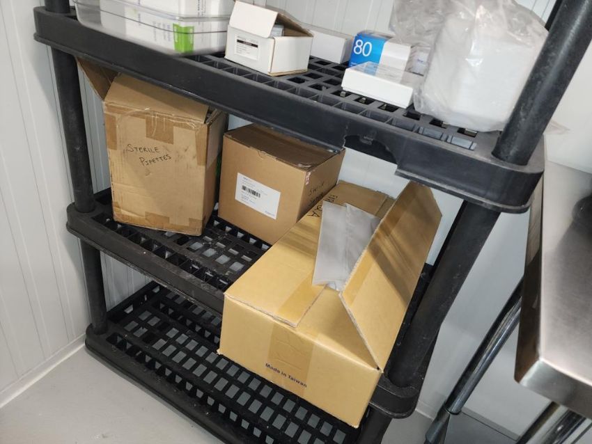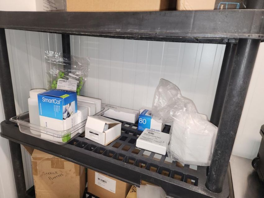 Plastic Rack, 6' High, 5 Shelves with contents. HIT# 2337277. Small Lab. Asset Located at 16 Upton Road, Scarborough, ON, M1L 2B8 Canada. Payment in USD Only.