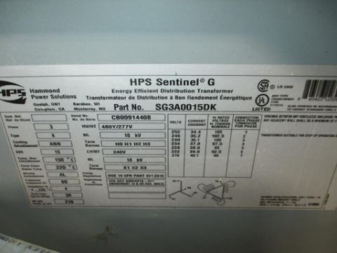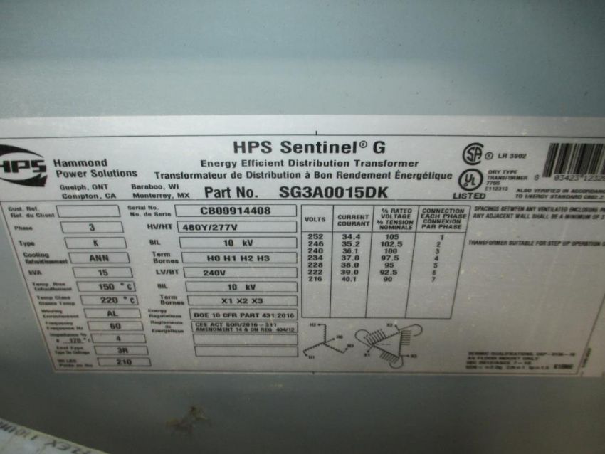 Hammond HPS Sentinel G Lot: (2) General Purpose Transformers, 3PH 15KVA 240D-480Y/277V AL 60HZ 150C 3R. HIT# 2329260. Loc: D18. Asset Located at 26545 Danti Court, Hayward, CA 94545.