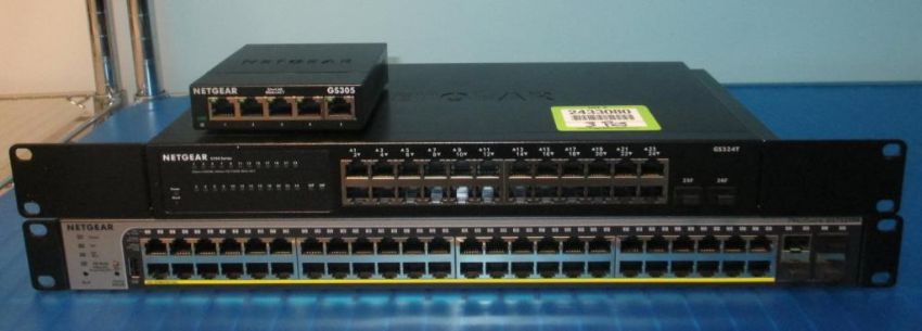 Netgear Lot: (3) Assorted Switches. Consisting of: (1) GS342T 24-Ports Gigabit Ethernet Smart Switch with 2 x 1G SFP Ports; (1) ProSafe GS752TPP 48-Port Gigabit Ethernet PoE+ Smart Switch with 4 SFP Ports; (1) GS305 SOHO Unmanaged Switch. HIT# 2433080. Loc: 410 IT Storage. Asset Located at 188 East Blaine, Suite 450, Seattle, WA 98102.