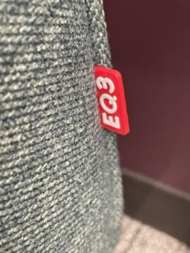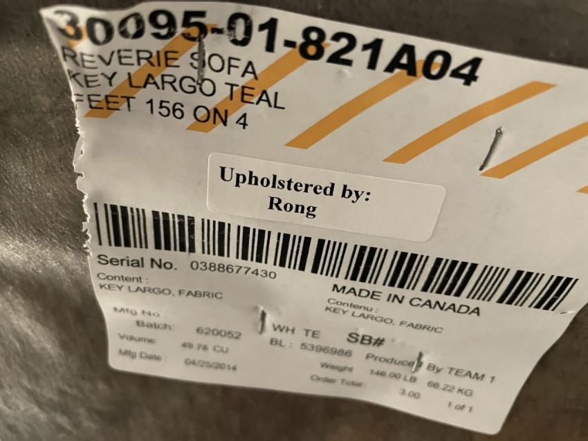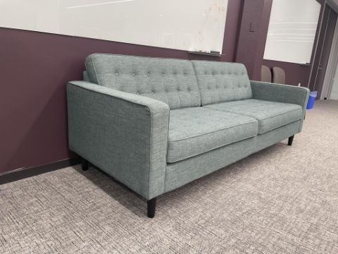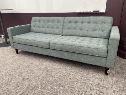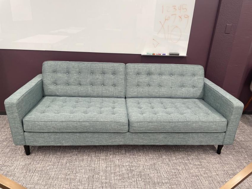 EQ3 Reverie 3-Seater Sofa, Key Largo Teal Fabric, Black Ash Legs. Dims = 86"L x 33"D x 32"H. HIT# 2366727. Loc: 7th Flr 7231. Asset Located In 1355 Market St. San Francisco, CA 94103.