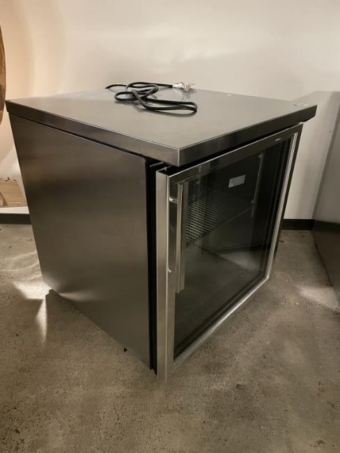 True TUC-27G-LP Stainless Steel Low Profile Undercounter Refrigerator with Glass Door, on Wheels. Overall Dims = 27.5"W x 30"D x 32"H. HIT# 2441110. Loc: 6th Flr. Asset Located In 1355 Market St. San Francisco, CA 94103.
