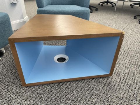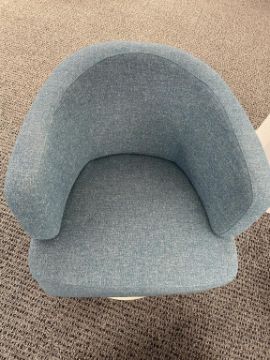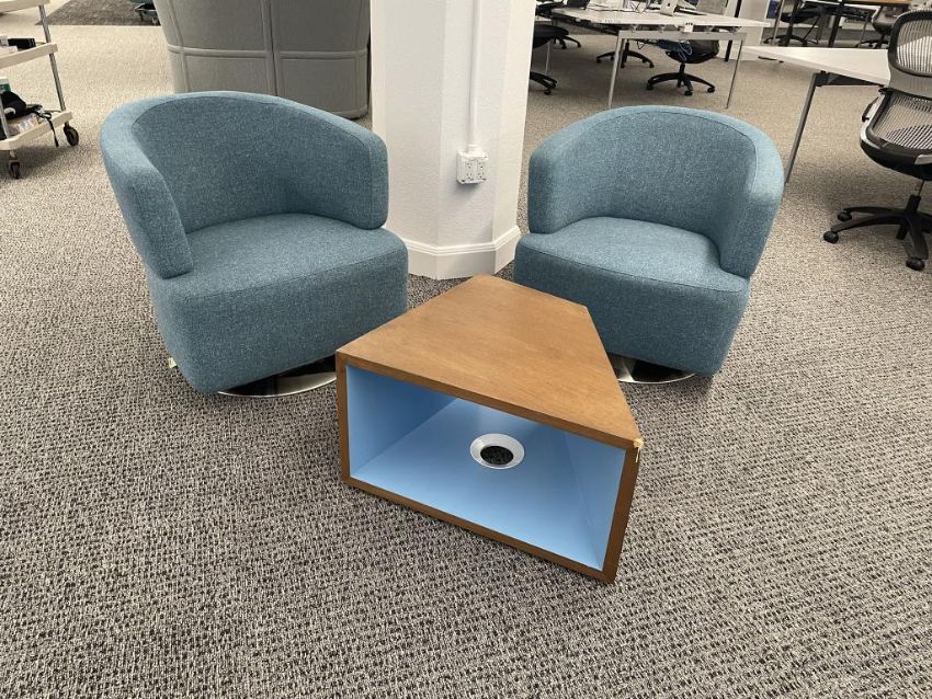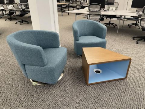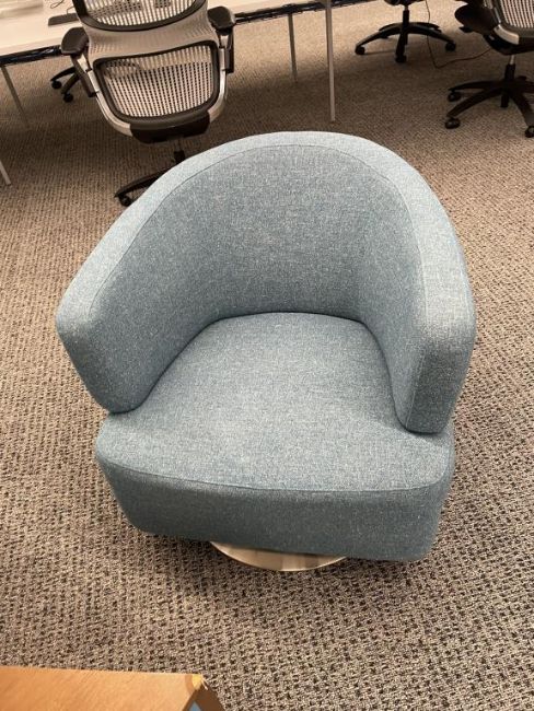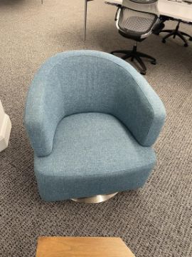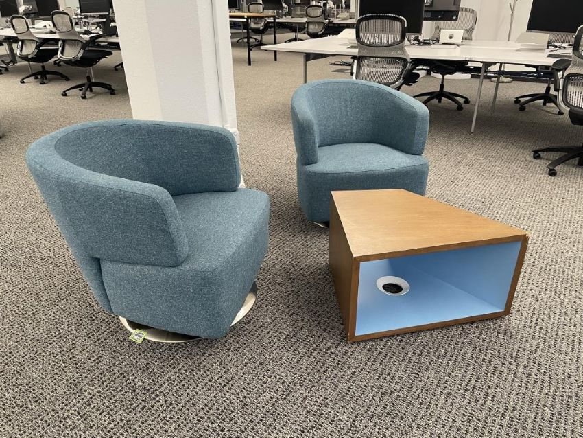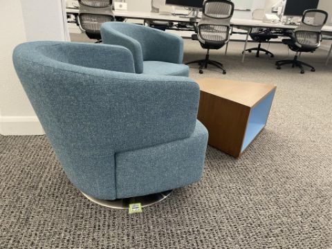 (3qty) Jason Furniture Swivel Chairs, Teal Fabric with Coalesse Sebastopol Table. Dims = 28.5"W x 31"D x 28"H. HIT# 2366770. Loc: 7th Flr 7327. Asset Located In 1355 Market St. San Francisco, CA 94103.