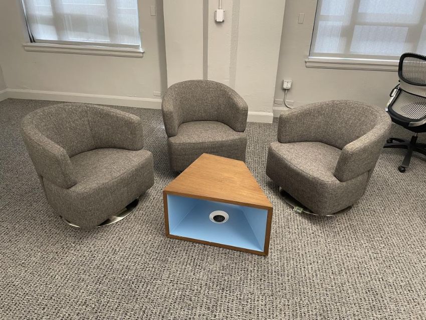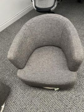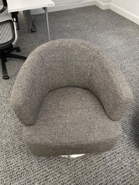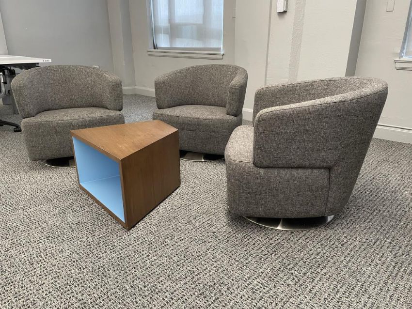 (3) Jason Furniture Swivel Chairs, Grey Fabric with Coalesse Sebastopol Table. Dims = 28.5"W x 31"D x 28"H. HIT# 2366799. Loc: 7th Flr 7305. Asset Located In 1355 Market St. San Francisco, CA 94103.