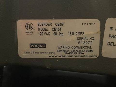 Waring Commercial Heavy Duty Blender CB16T. HIT# 2319501. Loc: 6th Flr Counter. Asset Located In 1355 Market St. San Francisco, CA 94103.