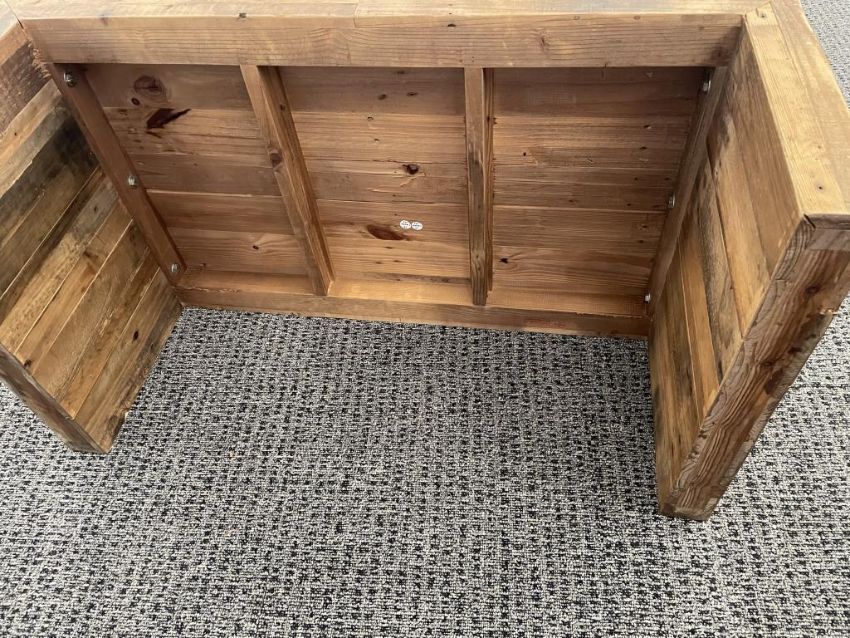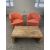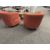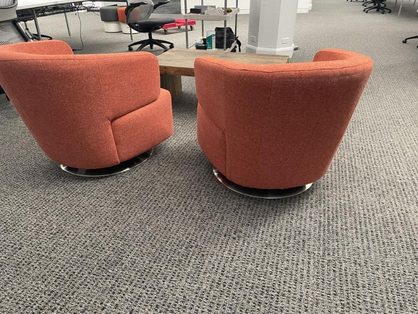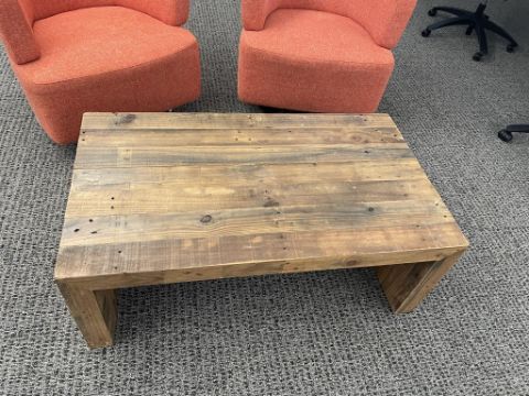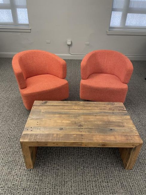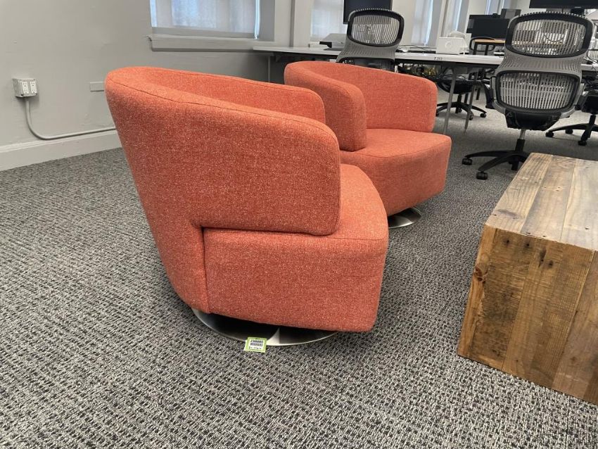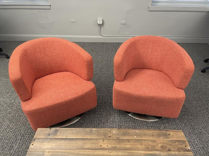 (2qty) Jason Furniture Swivel Chairs, Orange Fabric with Repurposed Wood Coffee Table. Chairs Dims = 28.5"W x 31"D x 28"H; Coffee Table Dims = 42"L x 24"D x 16"H. HIT# 2366660. Loc 7th Flr 7205. Asset Located In 1355 Market St. San Francisco, CA 94103.