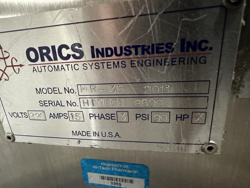 ORICS Industries MR-35 Rotary Filling and Sealing Machine, 220v (2011). S/n#HITECH 8690. HIT# 2447259. Loc: Back Warehouse. Asset Located at 225 Dixon Ave., Amityville, NY 11701.
